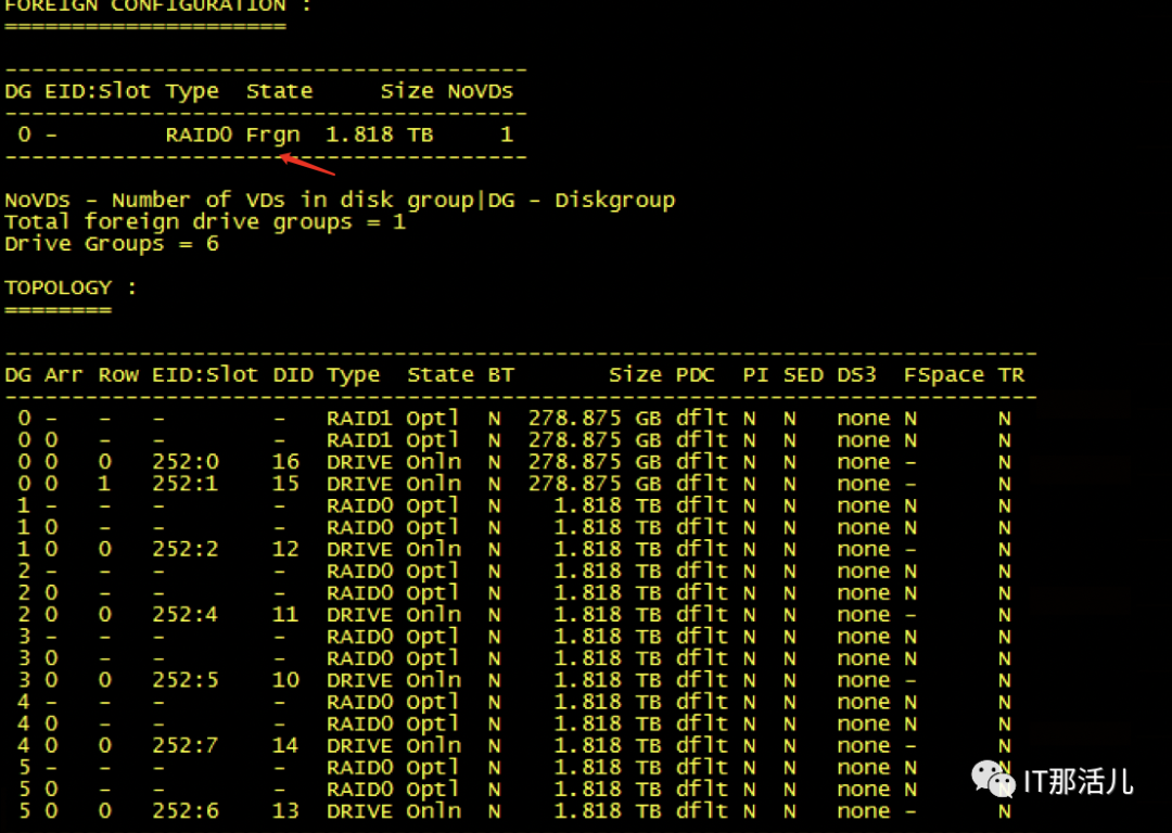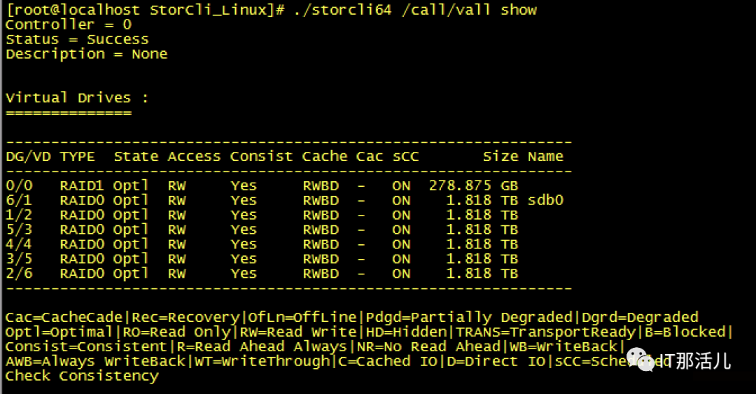 磁盘做完raid后,会在raid卡信息中变为vd,下面命令即为查看控制器下的所有vd信息:以上DG代表drive group,是配置raid建分组的顺序;VD代表virtual disk,即虚拟磁盘,对应的就是服务器中的sda、sdb等。当磁盘损坏时,我们使用./storcli64 call/eall/sall show查询出来,state会有UGood信息,此表示该slot号下的磁盘已经损坏,需要更换处理。上图表示slot3槽位的硬盘已损坏,需要更换处理。某次主机发现目录损坏,检查发现磁盘也消失了,进一步检查raid信息时,发现vd出现了frgn状态:./storcli64 /c0 show。以上说明DG0 已经脱离了,我们需要将frgn状态的DG重新导入,命令如下:./storcli64 /c0/fall import