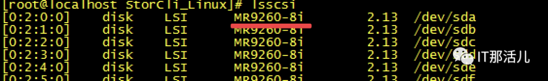 此命令表示点亮控制器0号252盘箱的1号和2号槽位。1)storcli工具虽然很强大,但是属于硬件底层操作,进行修改操作时一定要细心,仔细核对各项编号信息,避免进行误操作引发重大问题;2)经测试raid0模式的磁盘直接进行更换后重做raid会发生盘符改变,如之前盘符sdb,但是更换磁盘重做raid后,会变为sdg等,所以如果服务器在能停机的条件下,尽量停机更换磁盘更加保险。因raid卡厂商型号众多,使用时需先使用lspci等命令查询raid卡型号,确认支持后再使用。如下图型号即为LSI MR9260-8i。