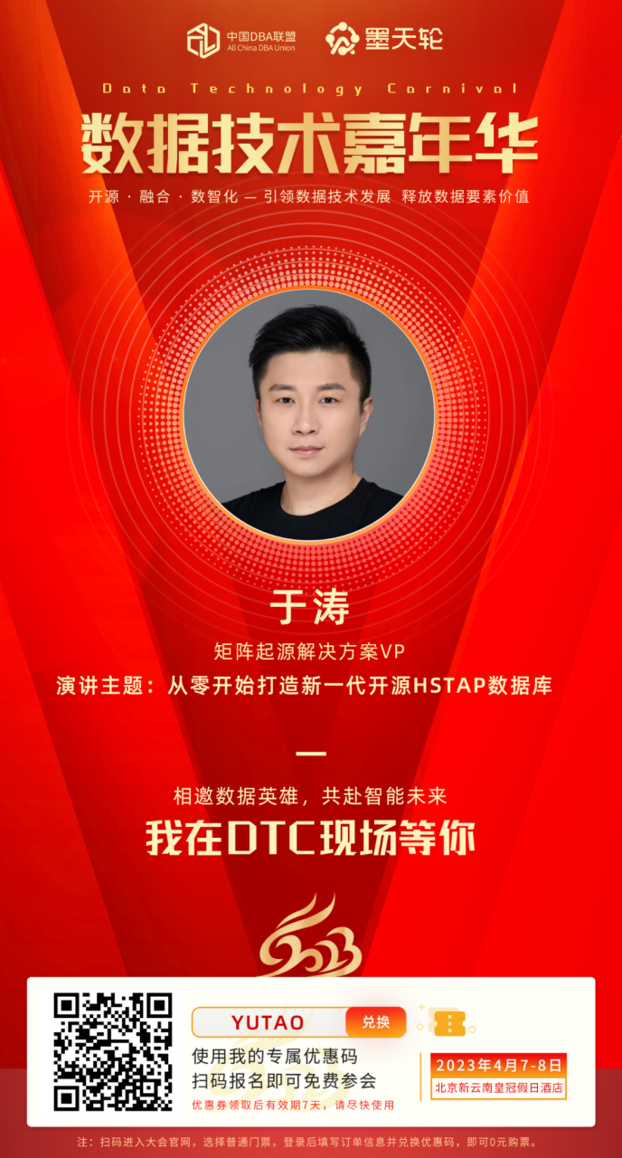想进一步了解MatrixOne的架构建设和产品能力吗?矩阵起源解决方案VP于涛将于2023年4月7日,在第十二届『数据技术嘉年华』,专题论坛『引领发展:中国数据库创新』带来题为《从零开始打造新一代开源HSTAP数据库》的主题演讲,将分享矩阵起源在MatrixOne的研发过程中遇到和解决的困难与挑战,在国产信创大背景下,为国产数据库创新提供参考。