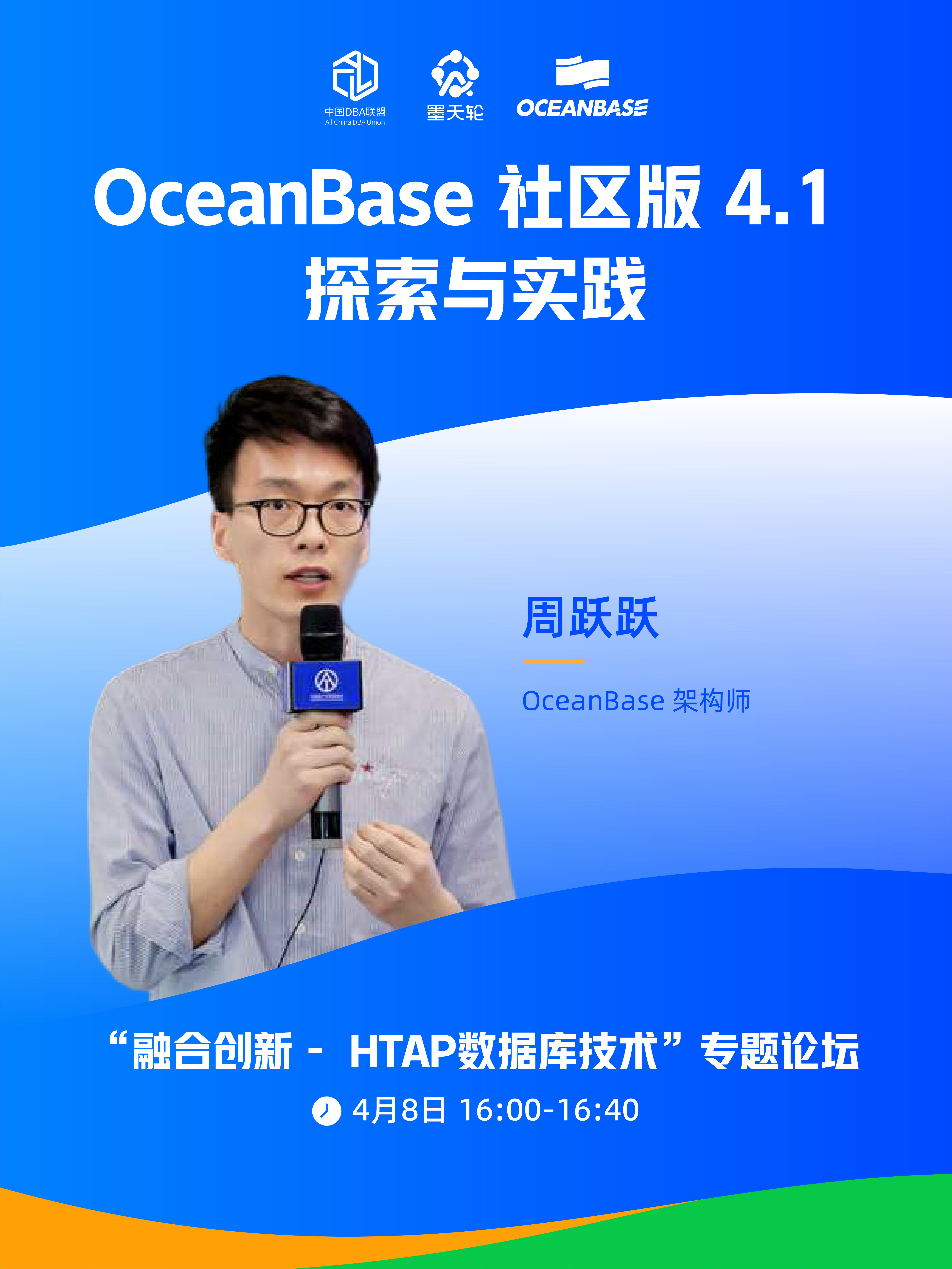 4月8日 16:00-16:40,OceanBase 架构师周跃跃将在 “融合创新 - HTAP数据库技术”专题论坛发表题为《OceanBase 社区版 4.1 探索与实践》的演讲,对 OceanBase 4.1 开放的核心特性进行技术解读,帮助有需求的企业用户使用和用好 OceanBase 社区版。