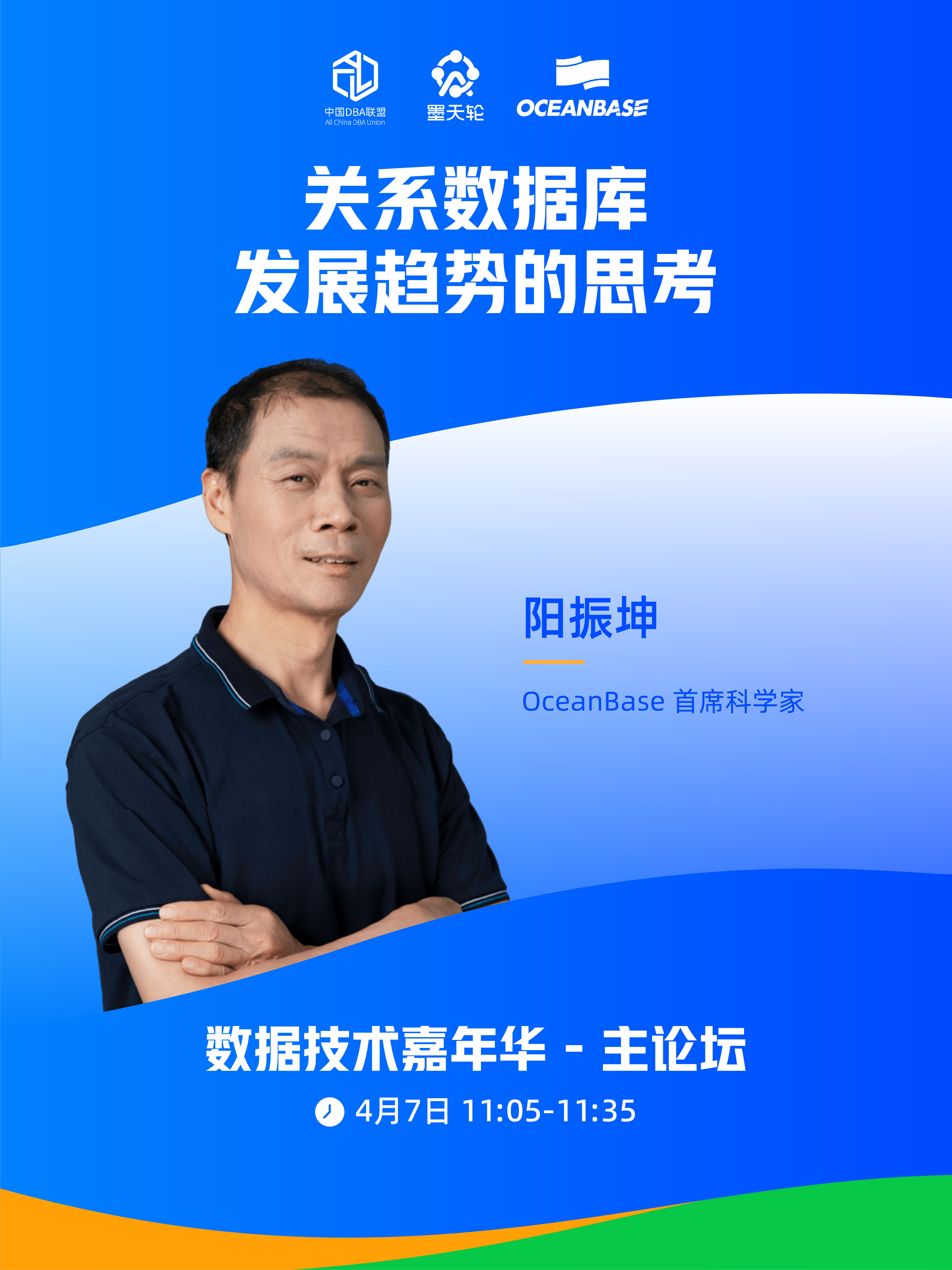 4月7日 11:05-11:35,OceanBase 首席科学家阳振坤将在主论坛发表题为《关系数据库发展趋势的思考》的演讲,带领大家回顾关系数据库的发展历史,探讨关系数据库在新技术背景下的发展方向。