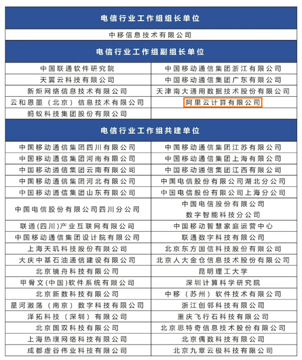阿里云瑶池携手主要电信客户“中国联通软件研究院”、“中国移动通信集团广东有限公司”等共同成为电信行业工作组副组长单位。