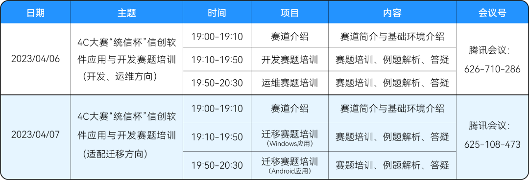 本次赛前培训由统信软件技术有限公司资深讲师、开发工程师、适配工程师、运维工程师等担任培训讲师,并通过腾讯会议对外直播。首期培训内容分为两场,第一场涵盖开发和运维赛题方向,第二场是适配迁移方向,每场时长90分钟,欢迎赛道内的大学生报名参会。