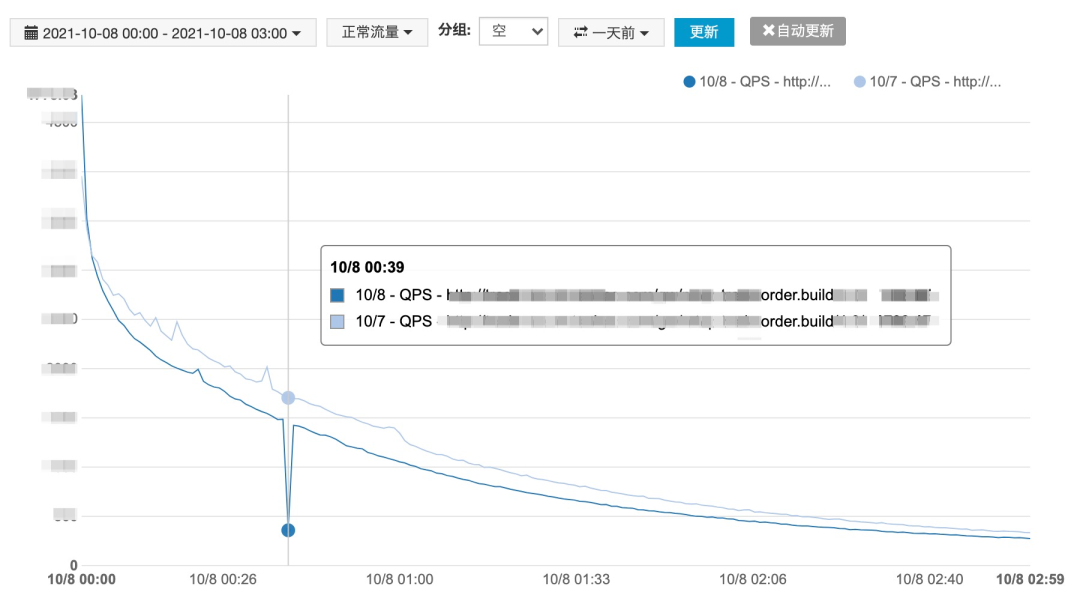 下面第二张图的创建订单接口在 10 月 8 号凌晨 00:39 分有一个非常明显的下跌,并且前一天的曲线是比较平滑的,这种现象大概率是接口异常导致的,已经影响了用户的下单体验,需要深入排查定位原因。