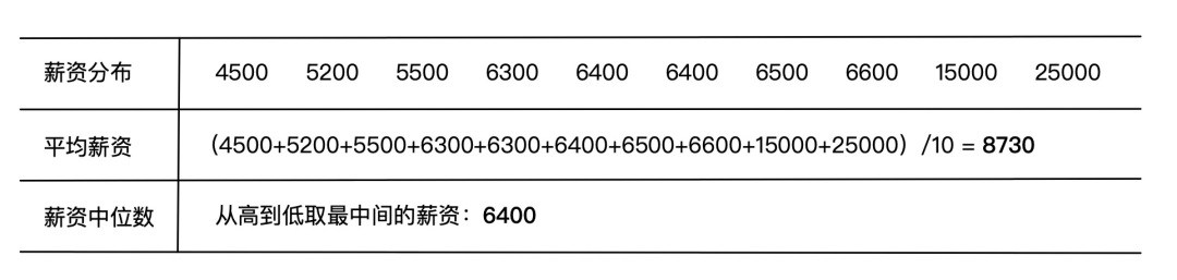 举个例子,你们公司每个同事的薪资收入可能各不相同,如果财务负责人要统计公司的中间薪资水平有两种方式,一种就是把所有人的薪资加在一起再除以人数,这样就得到了平均薪资;还有一种是将薪资从高到低排序,选取排在中间的那个人的薪资作为参考值,也就是薪资中位数。这两种做法的效果对比如下图所示: