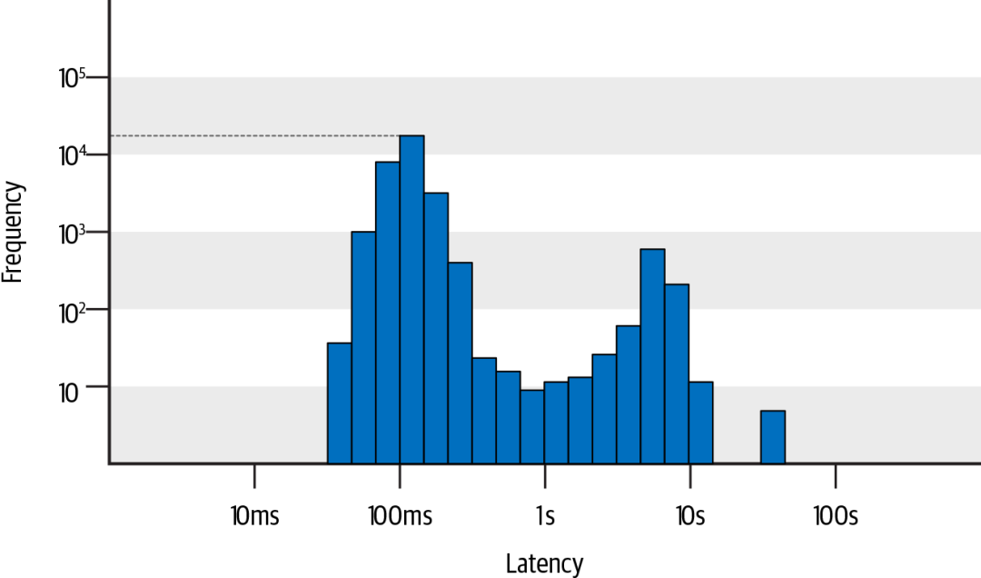 耗时分位数和平均值将接口响应速度抽象成了有限的几个数值,比较适合监控和告警。但是,如果要做深度的分析,识别所有请求的耗时分布情况,那就没有比直方图更适合的统计方式了。