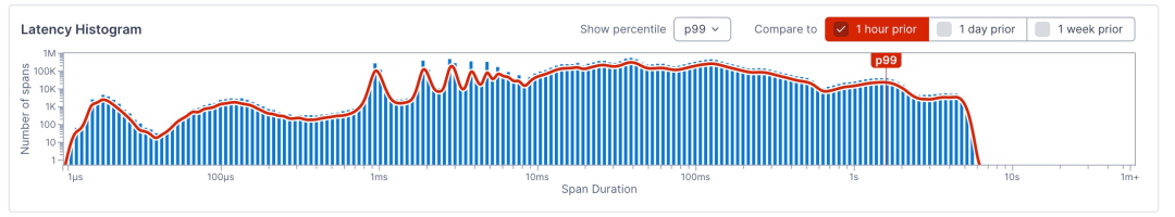 通过对比不同时段的直方图分布,我们可以精准发现每一个耗时区间的变化情况。如果你的业务是面向终端用户,每一个长尾请求都代表着一次糟糕的用户体验,那你应该重点关注耗时区间最高的那部分变化,比如 P99 分位数所在的区间;如果你的系统是负责图形图像处理,更加看重单位时间内的吞吐率,不那么在意长尾耗时,那你应该优先关注大部分请求的耗时变化,比如 P90 或 P50 所在区间的分布变化。