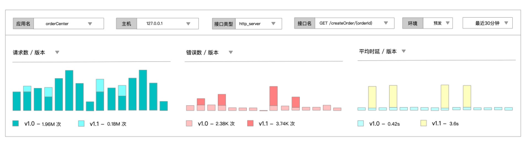 小玉作为订单中心的应用负责人,对于核心接口的版本更新一直非常谨慎,按照惯例,她会先在预发环境进行灰度用户引流,对比新老版本的差异,确认无误后再发布至生产环境。此时,小玉会同时对应用、接口、环境、IP等多个基础特征进行聚合,再结合自定义的版本标签对比流量状态变化,如下图所示,v1.1 新版本的接口耗时大幅上升,错误率也远高于 v1.0 版本,应该立即停止发布,回滚版本,避免影响线上用户体验。