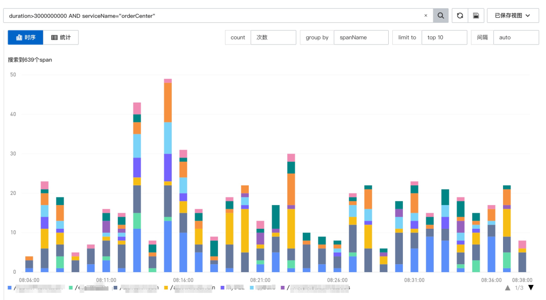 duration>3s AND serviceName="orderCenter" | SELECT SUM(request_count) AS total_count,spanName GROUP BY spanName ORDER BY total_count DESC LIMIT 10