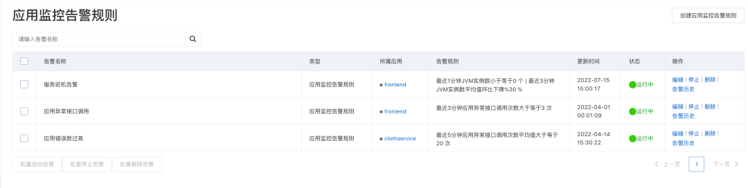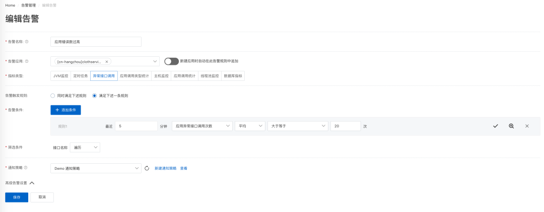 与上一小节的关键链路监控类似,经典链路告警规则包括核心接口的黄金三指标告警:流量下跌、响应变慢、错误率上升。此外,异常调用次数增多、慢 SQL 与缓存命中率下跌也是比较重要的链路告警规则,可以默认启用。