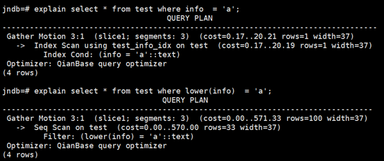 两个查询中,在第二个查询带有函数,因此索引无法使用。当然,如果建立一个函数索引,则可以使用索引,但函数必须是immutable的。下面简单介绍一下函数的三态,QianBase MPP函数有三个状态:IMMUTABLE、STABLE、VOLATILE。