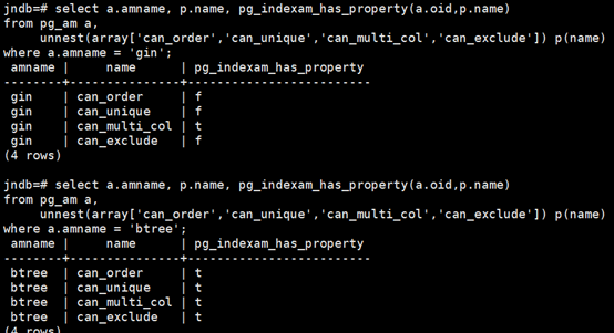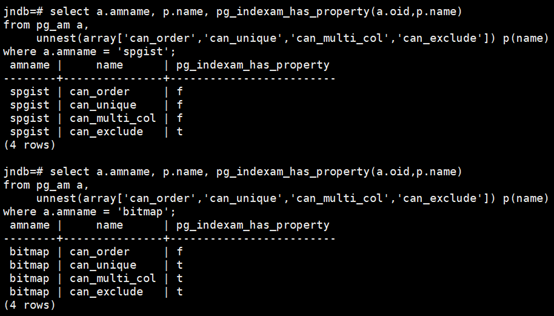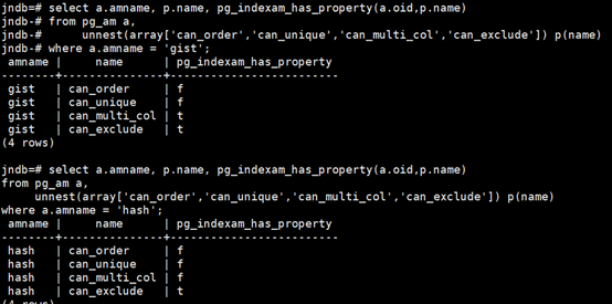每种索引有自己特定的场景,也有不支持的操作,QianBase MPP 6.0版本包含gist、hash、gin、btree、spgist、bitmap 6种类型索引,我们可以通过系统表来查询判断不同索引所支持的操作,如下: