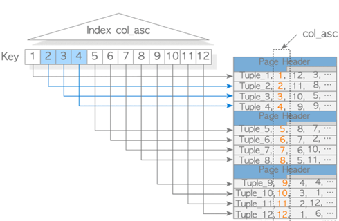 好的顺序扫描数据更加紧凑,都集中在一块,这样磁头扫过去,只需扫描有限个数据块,就可以获取到大部分所需数据。而糟糕的顺序扫描数据相对离散,需要扫描大量数据并过滤才能获取到想要的数据,这个也就是统计信息里面的correlation字段的作用,表示列的物理顺序和逻辑顺序的相关性,相关性越高,走索引扫描的离散块扫描更少,走索引扫描的离散块扫描代价越低。例子如下: