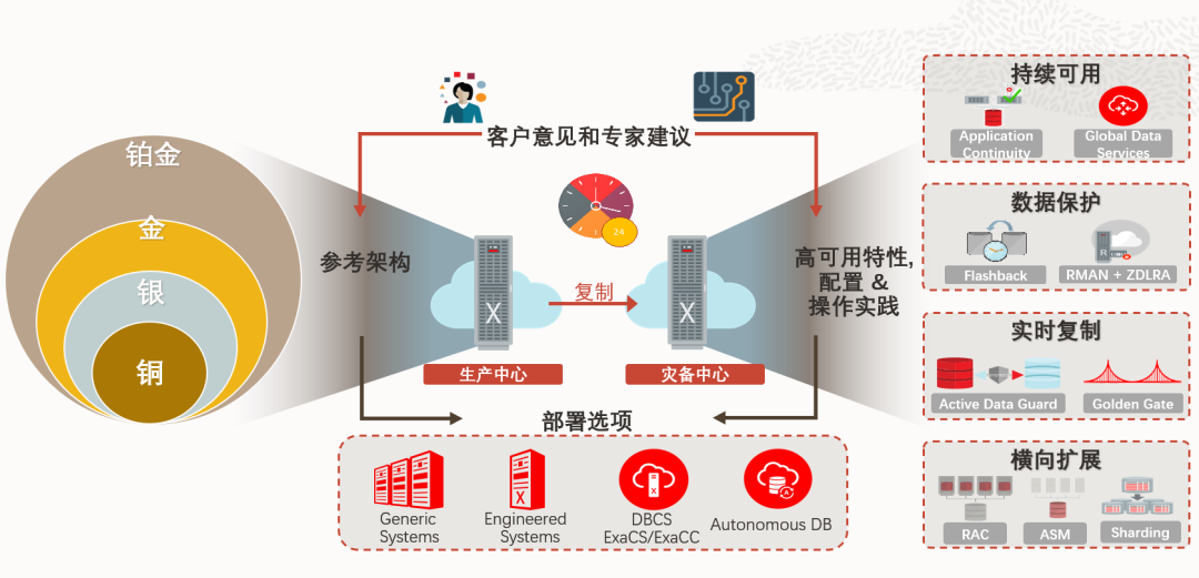 通过ASM解决了存储单点故障的问题 通过RAC解决服务器的单点故障的问题,实现本地的高可用 通过ADG、OGG解决站点级故障的问题,实现远端的高可用 通过Flashback纠正人为的错误,快速恢复数据 通过RMAN和ZDLRA实现终极数据保护 通过应用连续性、全局数据服务减少或避免应用中断,实现业务透明切换,保障业务的连续性