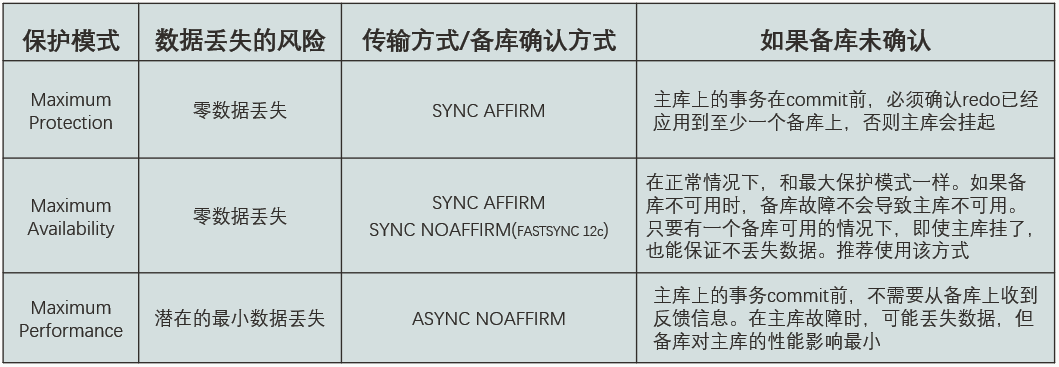 下图是Oracle Active Data Guard的保护模式,建议使用Maximum Availability模式,可根据实际情况,考虑是否采用Far Sync实例。Oracle Active Data Guard的部署很简单,也很稳定。对底层的存储设备没有要求,只要主备库的数据库版本和字节序一致就好,不论是集群,还是单机,使用文件系统或者ASM都没有问题。通常情况下,为了保证备库切换为主库后的性能和体验,我们建议备库使用同等的配置。如果只是作为数据保护,一台PC加本地硬盘或许也能搞定。