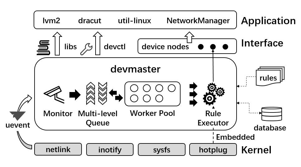 sysMaster项目不断发展完善,最新版本引入了1+1+N架构,即init(pid1) + core(manager) + exts(组件)。通过极简的init进程实现僵尸进程回收和保活监控功能,从而保证了1号进程的极致可靠性。同时引入了devMaster组件,可以灵活处理设备的变化,当前框架已经开发完成,实现了设备管理的uevent事件监听和worker的调度分发等功能。下一步的工作计划是完成对规则支持。