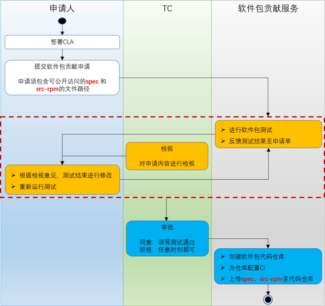 该平台实现了软件包贡献申请,测试,审批,发布流水线;并通过流水线视图,做到贡献过程透明化。