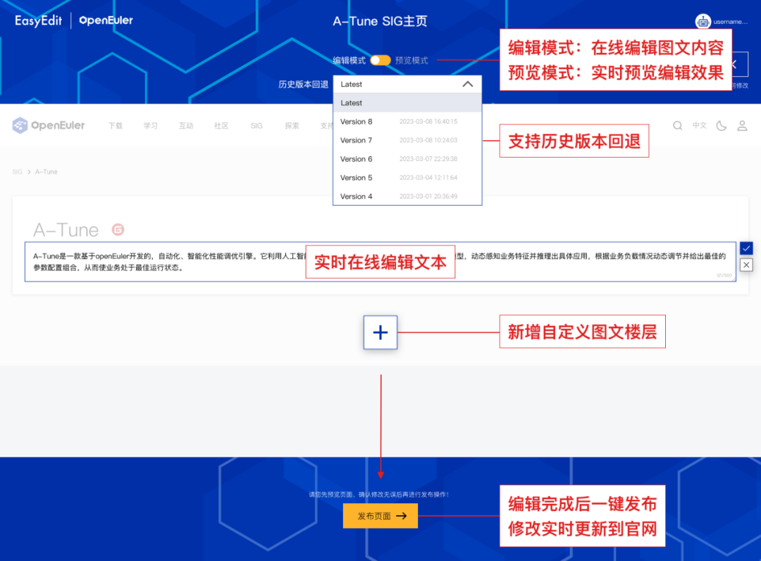 为降低openEuler官网开发门槛,及时更新SIG、活动等页面的动态信息,SIG-Infra与SIG-OpenDesign上线了在线编辑服务平台——EasyEditor。目前,EasyEditor已支持相关用户在线实时编辑SIG页面,满足各SIG及时更新简介、会议等信息,新增自定义图文展示楼层等的便利工作流。后续,在线编辑服务将陆续增加支持更多内容与页面类型的自主编辑能力,敬请期待!