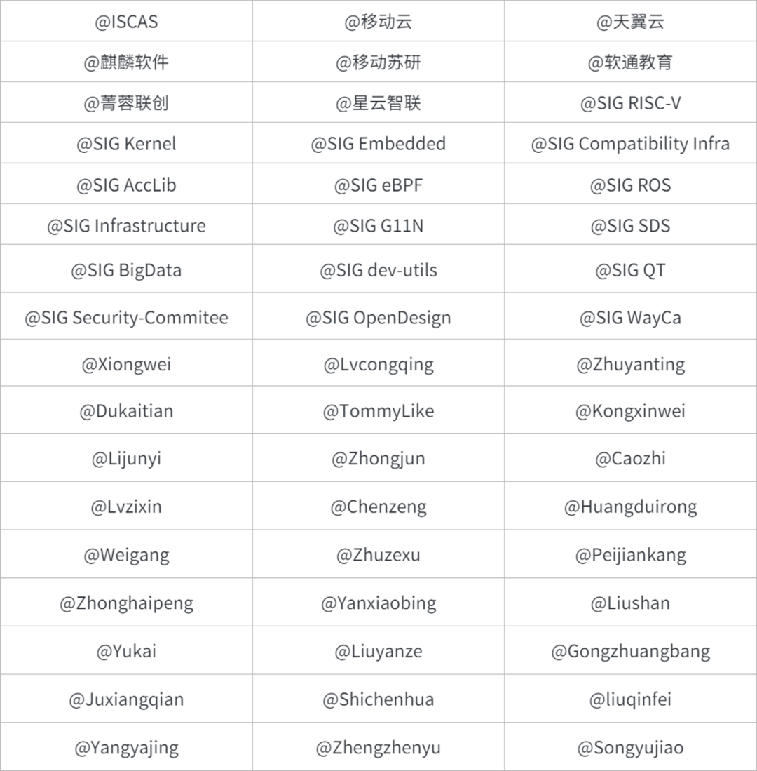 因为大家的辛勤贡献,openEuler的每一天都发生着好的事情。小编限于视野和能力,难免有所遗漏,在此表示歉意。同时,衷心感谢以下社区朋友、openEuler SIG组成员以及开发者们对本月月报的贡献: