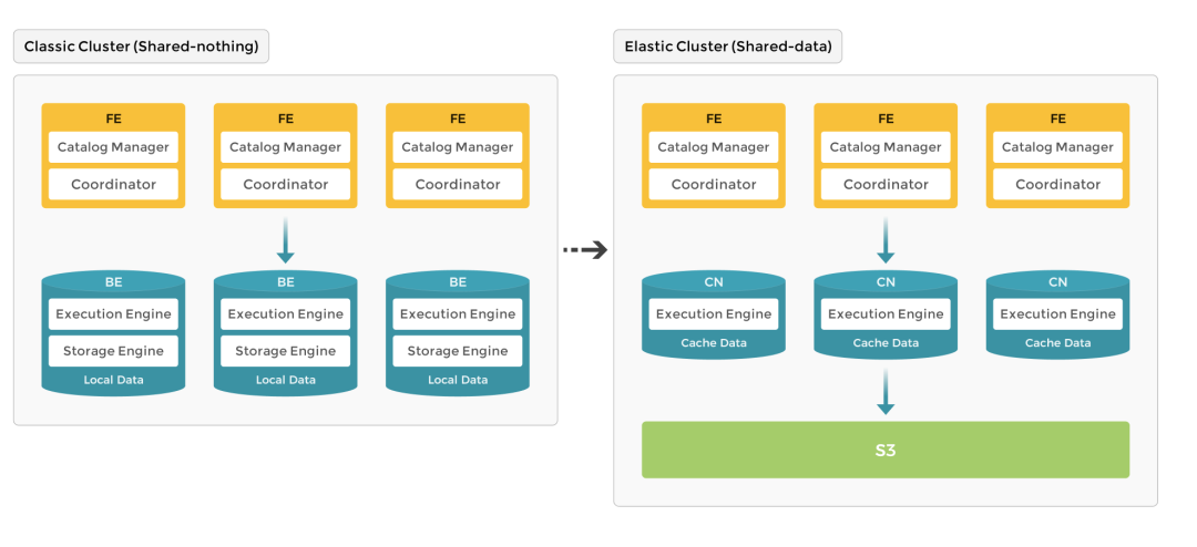 StarRocks 3.0 版本最重要的变化是架构上支持了存算分离模式。在该模式下数据将会持久存储在远程对象存储或 HDFS 上,而将本地磁盘作为缓存使用。存算分离架构下用户可以动态添加或删除计算节点,实现秒级的扩缩容能力,并支持表级别的缓存生命周期管理;在本地缓存命中的情况下,可以获得与存算一体架构相同的性能。