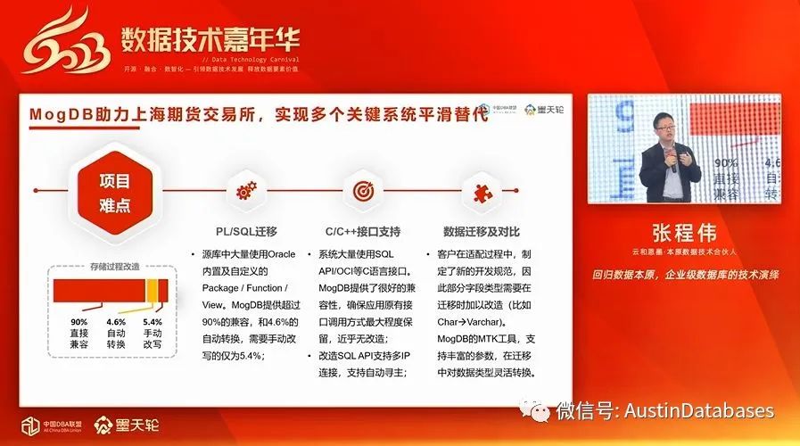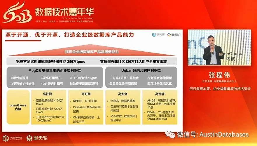 MogDB 将要发布新的数据库,面向工业2.0,同时为什么我们使用opengauss DB ,原因是OPENGAUSS 是一个完善的可持续发展的社区,有能力持续发展的数据库,我们在社区的贡献,除华为后,我们是第二在社区给出贡献的,我们在完善opengauss,提供了高可用,高性能,高安全,高智能得补充和优化,Mogdb 提高到了256tpmc ,Mogdb是一个企业级别的数据库,针对opengauss中的一些缺陷,我们进行了编码的改进,包含自治异步事务的提交,支持自动的读写分离,在高可用进行了优化等,MogDB 兼容ORACLE, MYSQL(80%) POSTGRESQL 等数据库