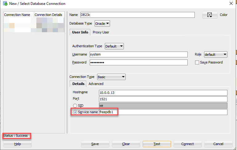 如果您使用SQL Developer进行连接,可以如下图所示连接数据库。在service name中填入freepdb1。
