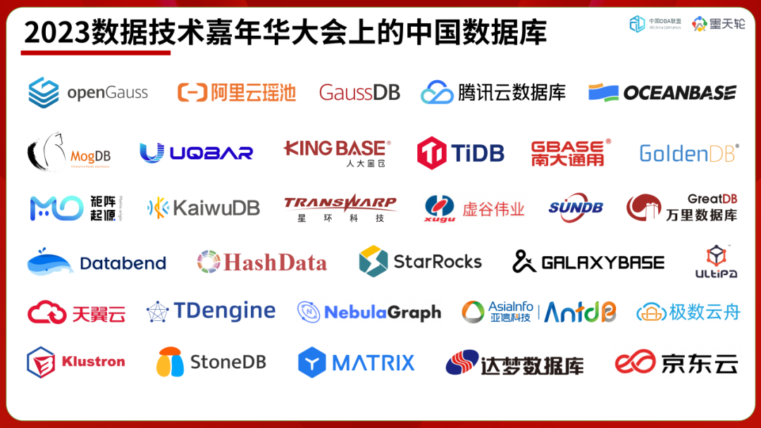 感谢工业和信息化部电子五所的指导!感谢云和恩墨、华为云、阿里云瑶池、OceanBase、腾讯云数据库、openGauss社区、南大通用、星环科技、万里数据库、KaiwuDB、金篆信科、亚信科技、涛思数据、人大金仓、PingCAP、矩阵起源、科蓝软件、创邻科技、红象云腾、本原数据等合作伙伴,以及中国IDC圈、DOIT、CSDN、科技中国、企业网D1Net、博文视点、TiDB社区、StoneDB社区、IT东方会、DataFun、OSChina等众多媒体、社区、出版社对第十二届数据技术嘉年华活动的大力支持!
