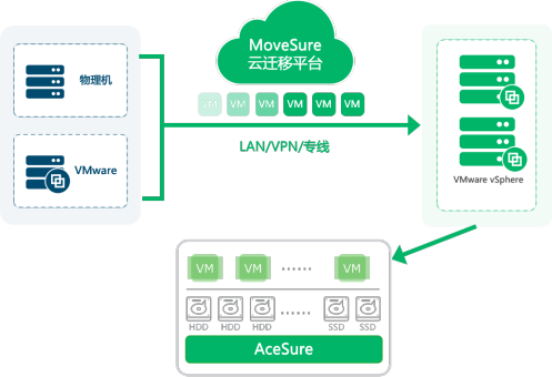 1 ► 在该烟草企业的IT架构中,存在多种类型的物理服务器,诸如普通功能服务器、USB key 认证服务器、数据库集群服务器,以及物理服务器搭建的虚拟化平台,承载着内部OA系统、财务系统、MES系统、能管系统及其他应用系统。通过数腾云迁移产品MoveSure将物理服务器和部分老版本的VMware虚拟机整机在线热迁移至VMware vSphere虚拟化新平台,先全量迁移系统整盘数据,再不间断迁移系统在持续运行中产生的新增量数据,保证迁移时业务不停机,能正常对外提供服务,并在业务低峰期进行系统迁移割接,将业务中断影响降低到最小程度。