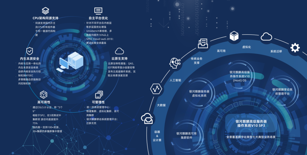 作为新一代高性能、高安全,易管理的面向云化的服务器操作系统,银河麒麟高级服务器操作系统V10 SP3满足客户对主机系统可靠性、安全性、性能、扩展性和实时性的需求。针对企业级关键业务,可支撑构建大型数据中心服务器高可用集群、负载均衡集群、分布式集群文件系统等场景,适用于数字化转型及工业互联网时代,标志着银河麒麟高级服务器操作系统面向云化的全面突破。