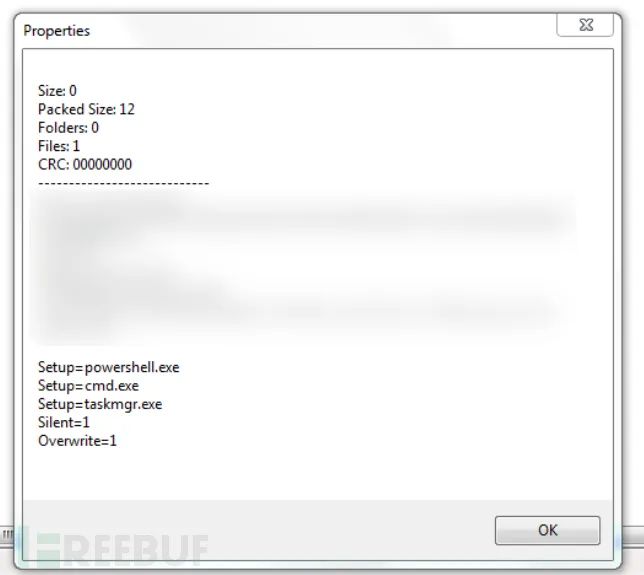 utilman.exe 触发的 SFX 文件不仅受密码保护,而且包含一个用作诱饵的空文本文件。SFX 文件的真正功能是滥用 WinRAR 的设置选项,以系统权限运行 PowerShell、Windows 命令提示符(cmd.exe)和任务管理器。