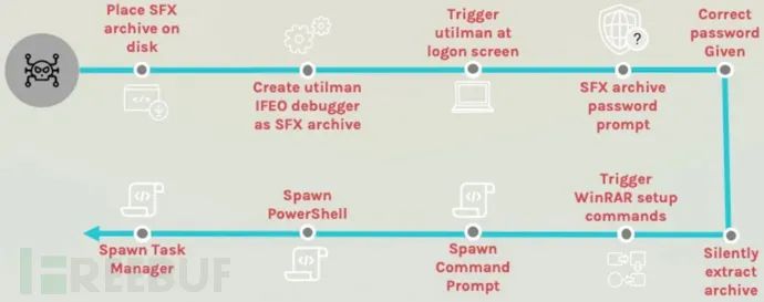 Crowdstrike 发现了一个网络犯罪分子使用窃取来的凭据滥用“utilman.exe”,将其设置为启动一个受密码保护的 SFX 文件,并且该文件之前已植入系统。(Utilman 是一种可访问性应用程序,可以在用户登录之前执行,经常被黑客滥用以绕过系统身份验证。)