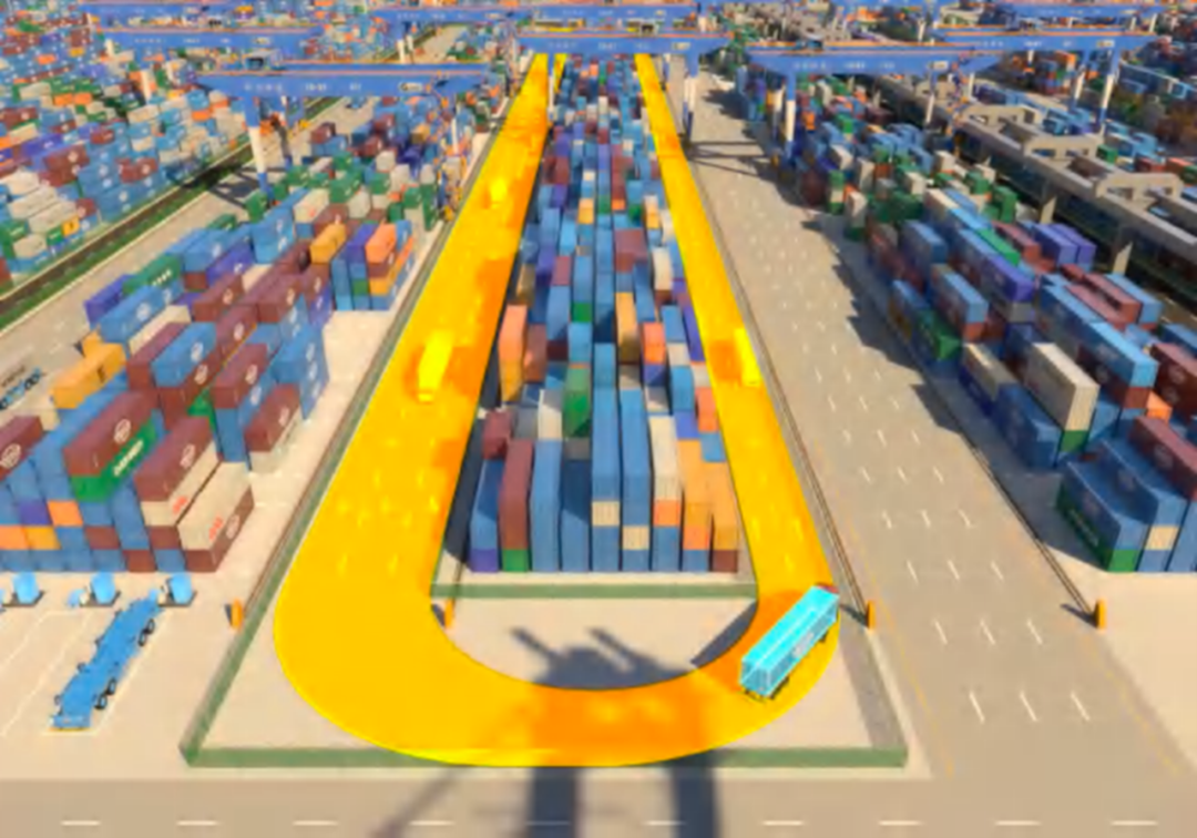 外集卡通过三段式智能闸口后,可直达堆场目标贝位,完成抓放箱后沿“U”型路径出港;而 IGV 沿着相邻的“I”型车道实现从海侧到堆场之间的作业,内外交通分流、安全高效。“U”型布局装卸点多,出箱灵活,后续可根据堆场作业需求增加轨道吊设备,灵活性、扩展性强,可显著提高堆场作业效率。