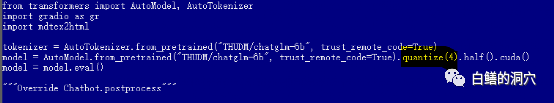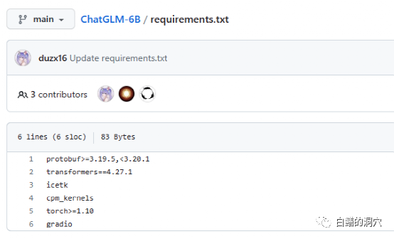 Requriements.txt文档里列出了ChatGLM使用的主要开源组件的清单与版本号,其核心是transformers,需要版本4.27.1,实际上要求没有这么严格,略低一点也没太大问题,不过安全起见还是用相同的版本为好。Icetk是做Token处理的,cpm_kernels是中文处理模型与cuda的核心调用,protobuf是结构化数据存储的。Gradio是用于利用Python快速生成AI应用的框架。Torch就不用我多做介绍了。