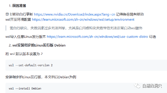 因为是在WSL subsystem上部署,因此LINUX只是一个仿真系统,并不是完整的LINUX,因此英伟达的显卡驱动只需要在WINDOWS上安装,不需要在WSL里激活。不过在WSL的LINUX虚拟环境中还是需要安装CUDA TOOLS。WINDOWS上的英伟达驱动一定要安装官网上的最新驱动,而不能使用WIN10/11自带的兼容性驱动,因此从官网上下载最新驱动并安装一定不要省略。