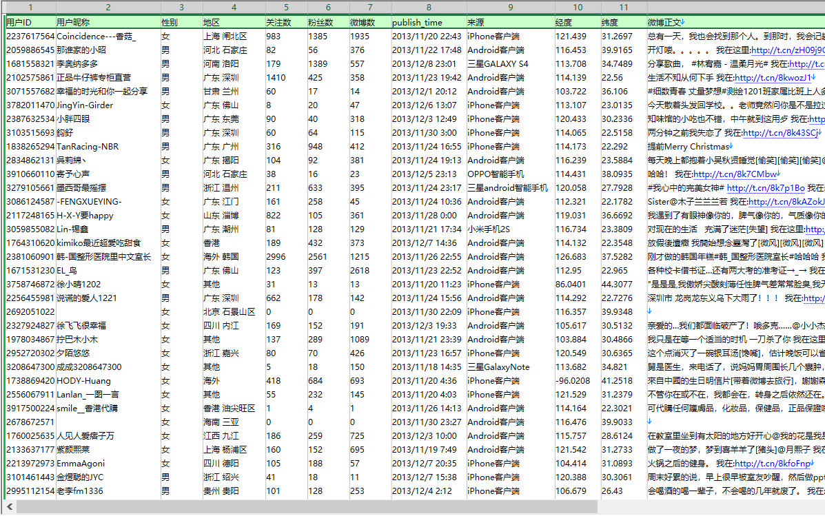 现在新浪微博数据较之以前比较难爬取了,IP容易受限,分享一个博主很早之前爬取的微博签到消息,数据是csv格式,如下