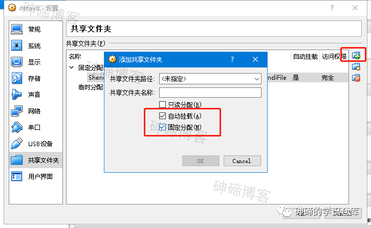 上面的共享文件夹路径为本机要共享的文件夹地址,共享文件夹名称为虚拟机内地址,勾选自动挂载,固定分配