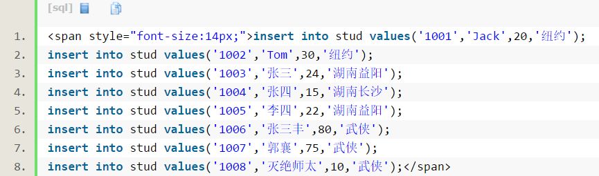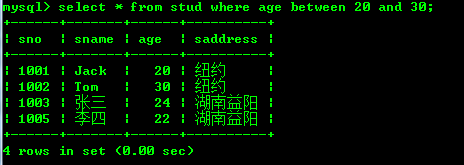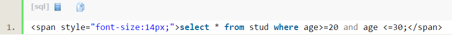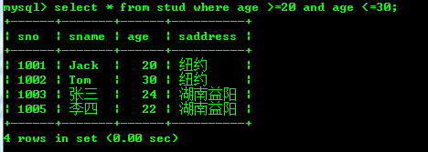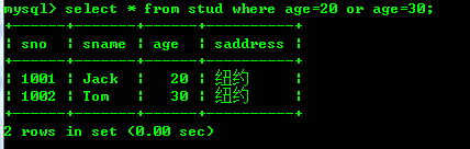 查询年龄等于20或者年龄等于30的stud表中的数据: