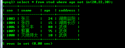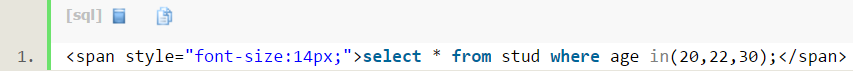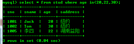 查询年龄为20,22和30的stud表中的数据: