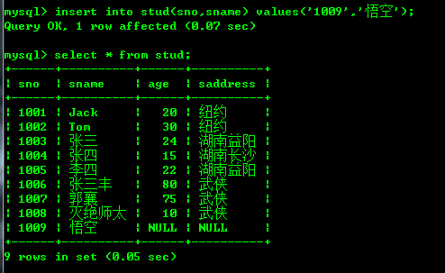 险插入一行数据,让他的age为null;