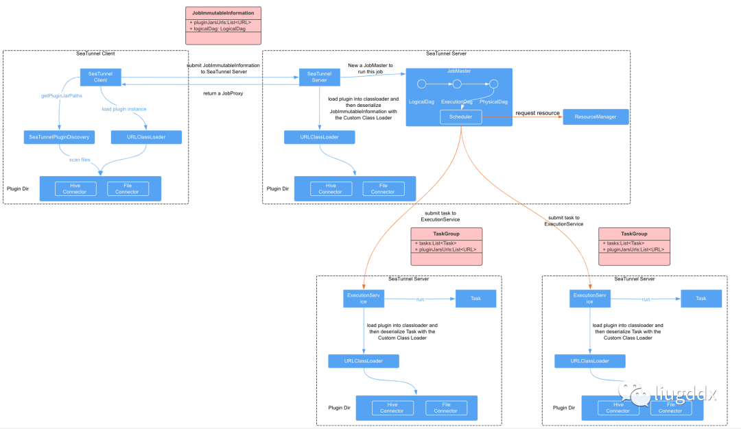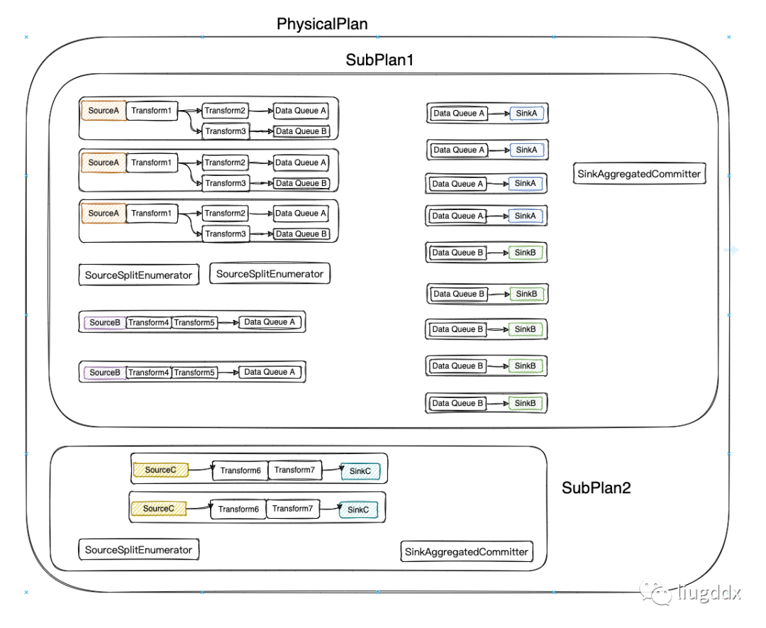SeaTunnel引擎会收到客户端发送过来的逻辑计划,引擎需要将其转化为可以直接执行的物理计划。因此,需要对逻辑执行计划进行处理,通过转换生成物理计划。具体过程如下:收到逻辑计划,我们需要去除多余的Actions,并验证Schema(Transform2和Transform 5应该是一样的)(1)Transforms需要合并,合并的依据是Transform后数据是否会被拆分(如果没有shuffle则会将transform合并)。我们将Pipeline按照并行度拆分成单独的可执行任务,并且同时需要添加SourceSplitEnumerator和SinkAggregatedCommitter任务,可以将任务发送到executionService。然后任务就可以正常运行了。第三步:将taskGroup调度到指定node上等待运行在master节点上将physicalPlan拆分成pipeline并将pipeline拆分成taskGroup分别调度到不同节点上进行执行。- physicalPlan:用户提交的job被解析成可以运行的执行计划。