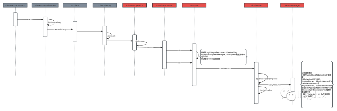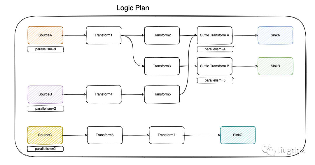 TaskExecutionService 是一个执行任务的服务,将在每个节点上运行一个实例。它从 JobMaster 接收 TaskGroup 并在其中运行 Task。并维护TaskID->TaskContext,对Task的具体操作都封装在TaskContext中。而Task内部持有OperationService,也就是说Task可以通过OperationService远程调用其他Task或JobMaster进行通信。CoordinatorService是一个充当协调器的服务,它主要负责处理客户端提交的命令以及切换master后任务的恢复。客户端在提交任务时会找到master节点并将任务提交到CoordinatorService服务上,CoordinatorService会缓存任务信息并等待任务执行结束。当任务结束后再对任务进行归档处理。SlotService是slot管理服务,用于管理集群的可用Slot资源。SlotService运行在所有节点上并定期向master上报资源信息。第一步:jobconf转换为LogicDag