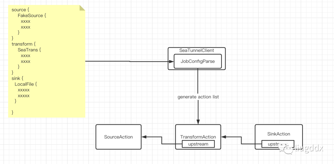 我们通过job的配置文件定义job流程,因此 SeaTunnelClient 需要做的第一件事是解析job配置文件并生成action列表。action 类似于 Flink 中的 operator,是对 SeaTunnel API 的封装。一个action包含 SeaTunnelSource 或 SeaTunnelTransform 或 SeaTunnelSink 的实例。每个action都需要知道它自己的上游。public interface Action extends Serializable {