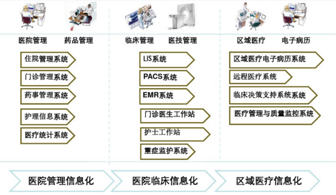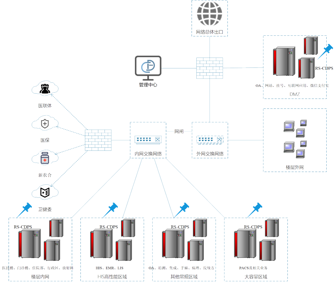 该医院的应用系统种类繁多,包括管理信息化,临床管理信息化以及区域医疗信息化模块,下设HIS医院管理信息系统、LIS 实验室管理信息系统、PACS影像归档和通信管理系统等10多种应用系统以及OA、ERP等管理系统。