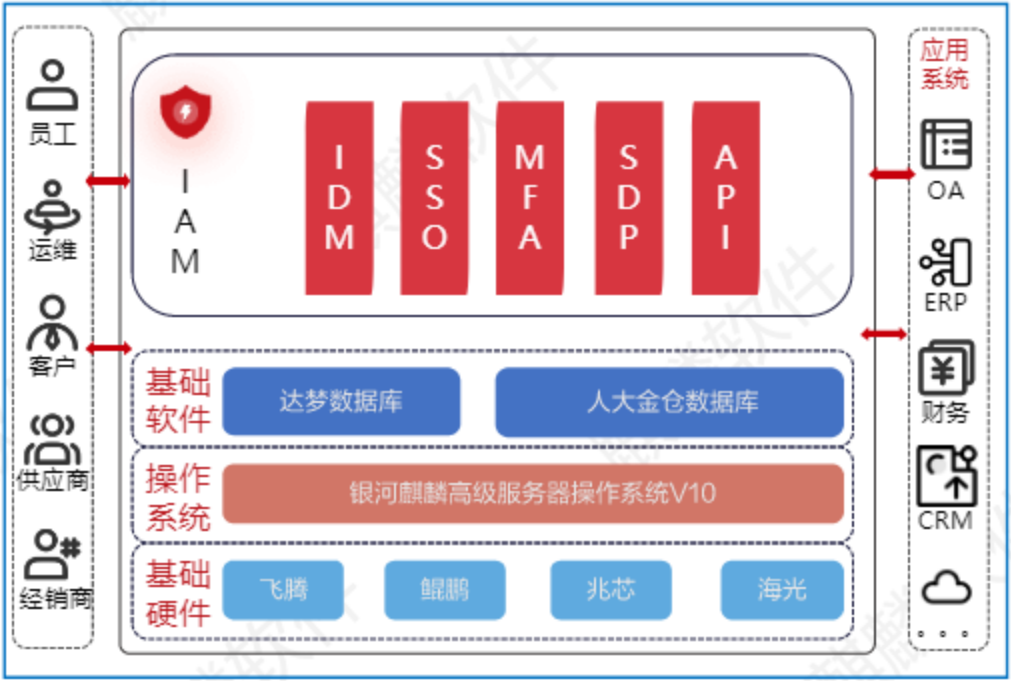 解决方案基于银河麒麟高级服务器操作系统V10,在保证基础运行环境安全、稳定、高效、灵活的基础上,以用户身份数据为中心,打造一体化零信任安全架构。从用户接入前的SDP构建虚拟边界,隐藏资源和端口;再到中间IAM的统一身份管理认证、权限分配及审计管理等5A能力;最后通过API网关实现用户对各业务系统的安全访问。