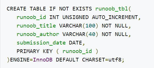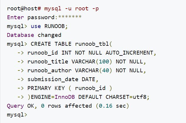 以下例子中我们将在 RUNOOB 数据库中创建数据表runoob_tbl: