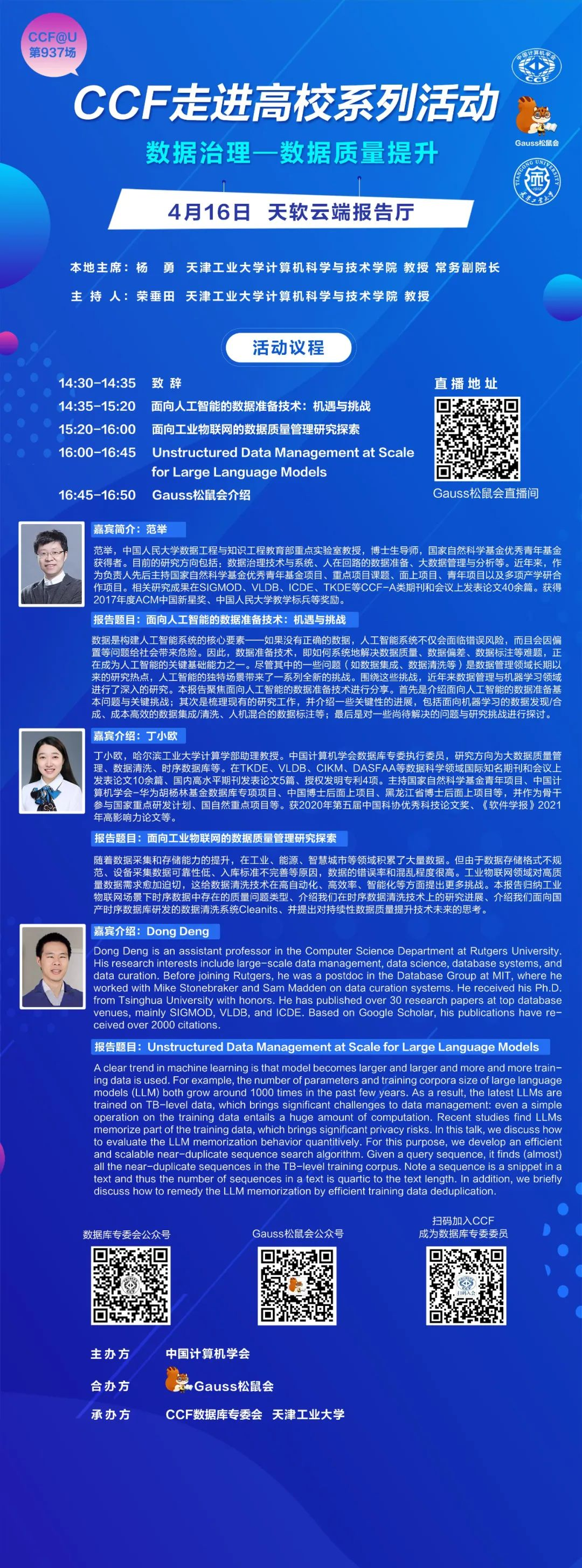 Gauss松鼠会携手中国计算机学会,共同打造走进高校系列活动—天津工业大学站,本次活动主题为:数据治理—数据质量提升。届时,三位学术界大咖将进行“面向人工智能的数据准备技术: 机遇与挑战”、“面向工业物联网的数据质量管理研究探索”、“Unstructured Data Management at Scale for Large Language Models”的主题分享,干货满满,不容错过!