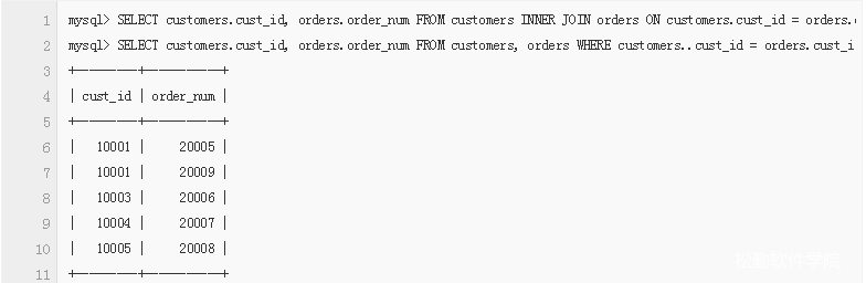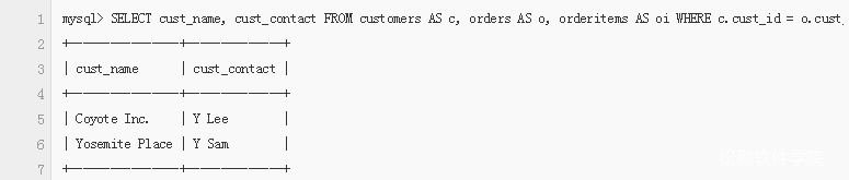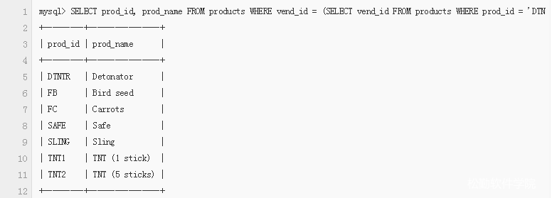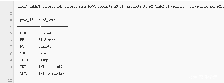 分析:此方法利用 子查询(嵌套查询),缺点:多次输入vend_id。相应的联结查询方式为: