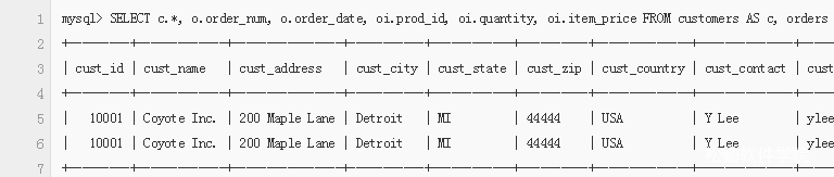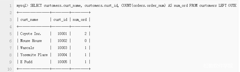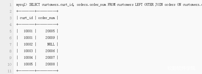 注意:使用OUTER JOIN时,必须指明RIGHT,LEFT关键字(RIGHT指出,OUTER JOIN右侧的表)。customers LEFT OUTER JOIN orders从左侧customers表中选择所有行。