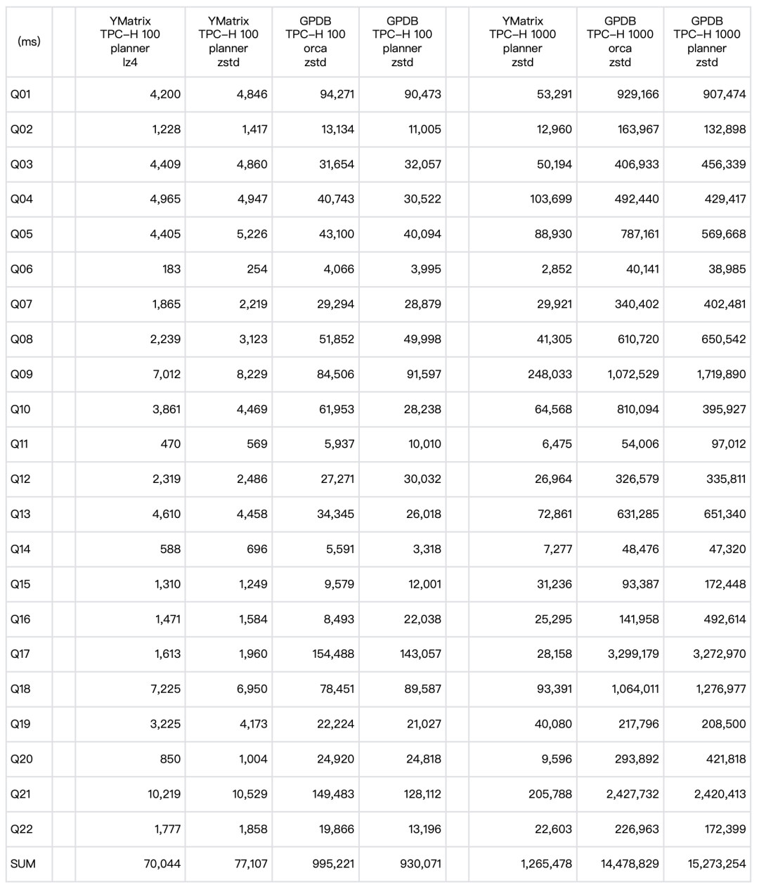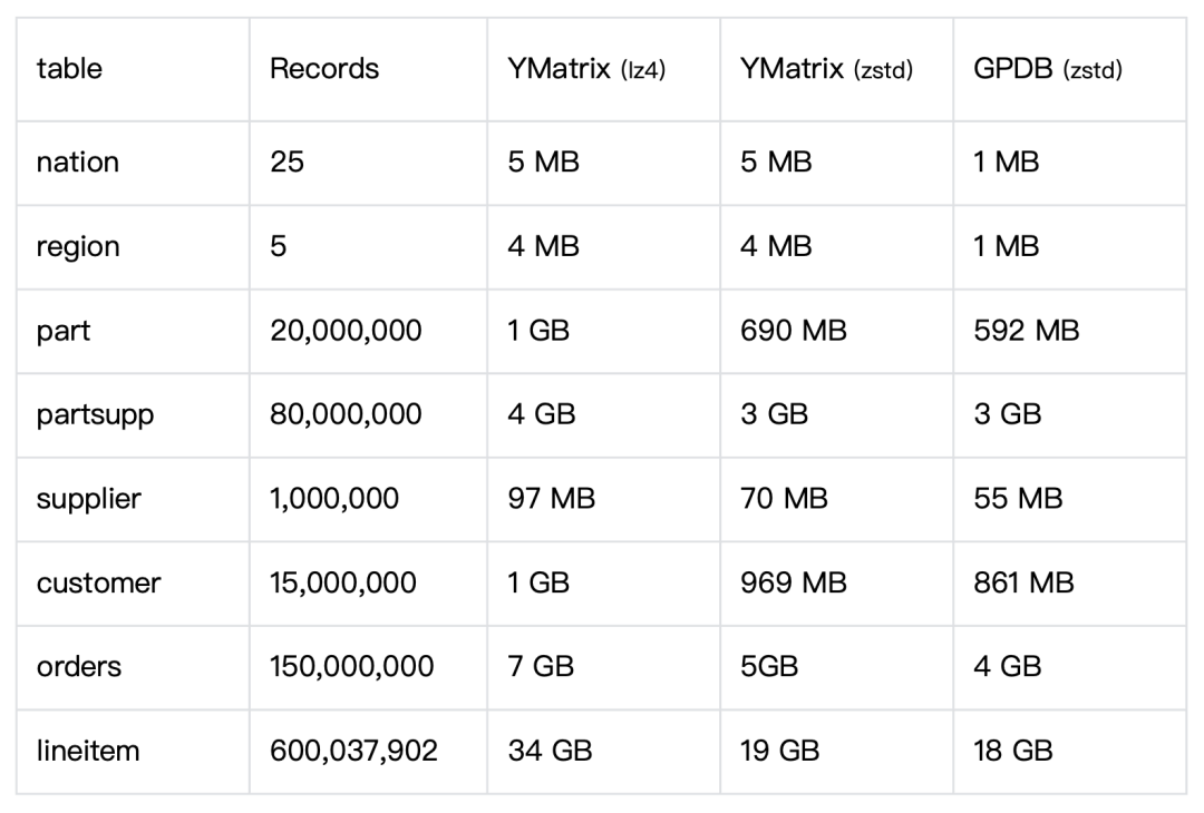 YMatrix 的 TPC-H 100 的性能数据采用的是 lz4 的压缩格式;GPDB 的 TPC-H 100 的性能数据采用的是 zstd 压缩, compresslevel=1 ,因为开源的 GPDB 不支持 quicklz 压缩格式,所以目前只能采用 zstd 压缩来进行对比;YMatrix 和 GPDB 的 TPC-H 1000 性能数据都是采用的 zstd 压缩, compresslevel=1 。