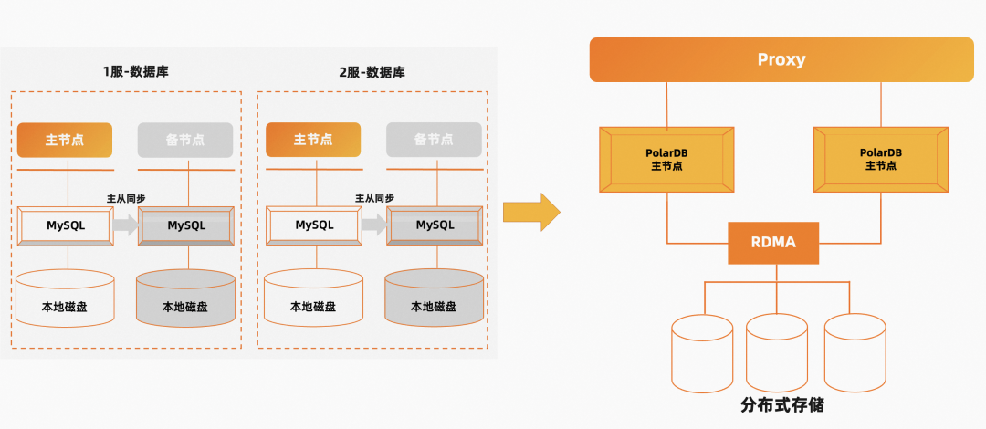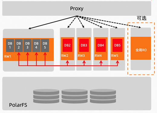 ● 原先每个Region下相互独立的MySQL实例转变为一整套PolarDB多主集群架构,多主集群基于数据池化实现主主互备,每个主节点不再冗余一个独占的备节点。
